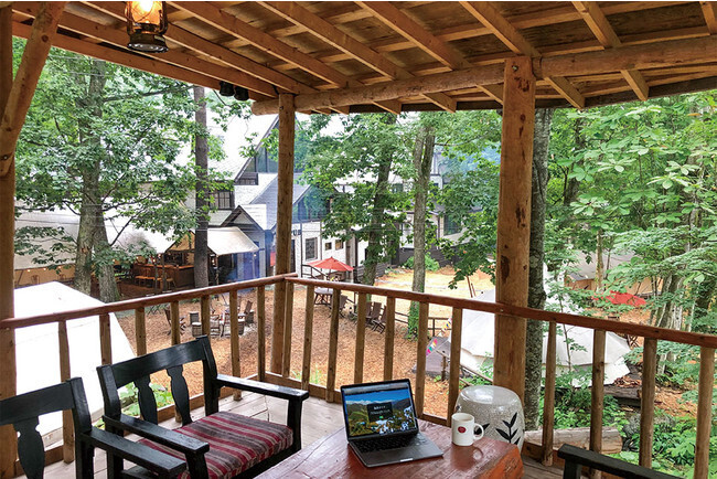 ワーケーションとは、「ワーク」と「バケーション」を組み合わせた造語で、観光地やリゾート地で休暇を取りながらテレワーク(リモートワーク)する働き方だ。白馬樅の木ホテルでは、ツリーハウスや温泉の足湯を含め、全てのグランピング施設でWifiと電源が完備していて、快適にラップトップでの仕事が可能だ。
