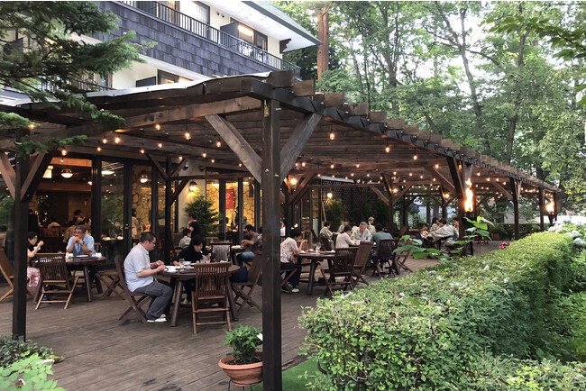 ホテルレストラン外のテラスには、パーゴラと呼ばれる格子状の屋根を持つタープが建てられていて、夜のディナーテイムには地元信州の素材を使った本格的なBBQを提供する。こちらのレストラン、屋外での食事提供となるため感染症のリスクが低く、屋根もついているため雨天でも利用が可能だ。また、WifiとAC電源を完備しているので、昼間はワーケーションでの利用も可能である。