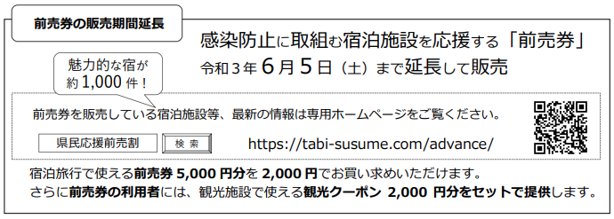 感染防止に取り組む宿泊施設を応援する「前売券」を6月5日(土)まで延長して販売している。前売券を販売している宿泊施設等(魅力的な宿が約1,000件)、最新の情報は専用ホームページをご覧下さい。宿泊旅行で使える前売券5,000円分を2,000円でお買い求め頂ける。さらに前売券の利用者には、観光施設で使える観光クーポン2,000円分をセットで提供する。