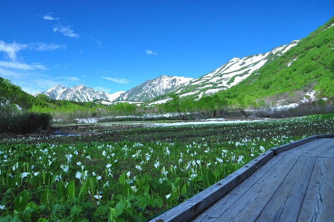 栂池自然園で見られるミズバショウは本州で最も遅咲きと言われ、園内には数十万株が咲き誇る。栂池自然園入口にあるミズバショウ湿原は木道でバリアフリーとなっており、車いすでも散策が可能だ。栂池自然園は日本でも有数の高層湿原だ。
