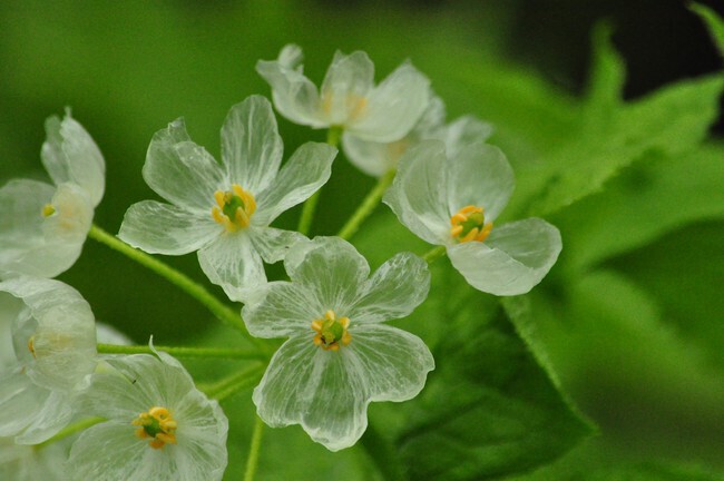 栂池自然園で6月~7月頃に出会える直径2㎝ほどの小さな純白の花を咲かせ、開花するとわずか1週間ほどで散ってしまう植物だ。雨に濡れると花びらが透明になる不思議な多年草で、冷涼な高地で湿度が高く、日本では極限られた地域でしか見る事ができない希少な高山植物だ。よって雨の日の撮影がおすすめだ。