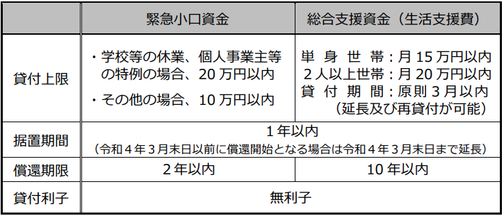 緊急小口資金等特例貸付の受付期間が 8月末まで延長(据置期間1年、無利子) 貸付上限は20万円以内、10万円以内 |