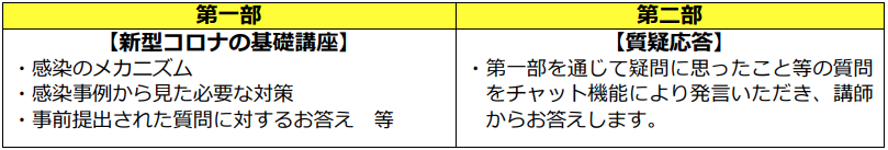 飲食店関係の皆様に、「正しく」「適切に」新型コロナウイルス感染予防策を講じていただく ため、オンラインによるセミナーを開催する。「新型コロナの基礎講座」のほか、「私のやり方は正しかったのかな?」「こんなときはどう したらいいの?」など日頃感じている疑問や不安にも専門家がお答えする。