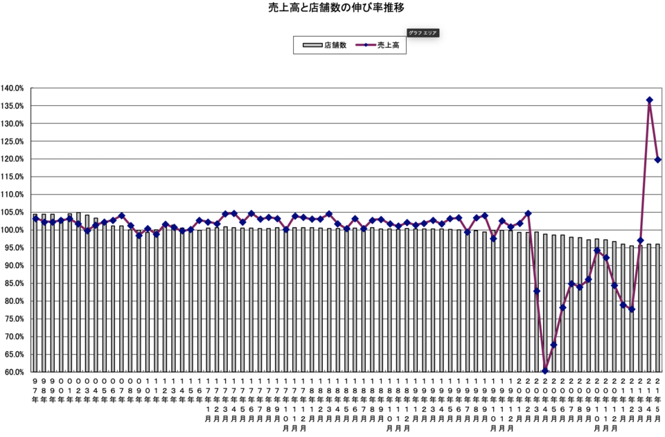 東京、大阪、京都、兵庫の4都府県に発令されていた緊急事態宣言は5月も継続され、更に愛知、福岡なども追加となり、これら宣言地域では酒類提供店は休業を要請された。更に宣言地域とまん延防止措置対象地域が全国的に広がり、外食店舗の営業時間•酒類提供は継続して制限を受けている。全体概況では、5月の全体売上げは119.8%となっているが、1回目の緊急事態宣言下にあった昨年5月との対比にすぎず、一昨年比では80.2%と、回復への出口はまだ見えていない。
