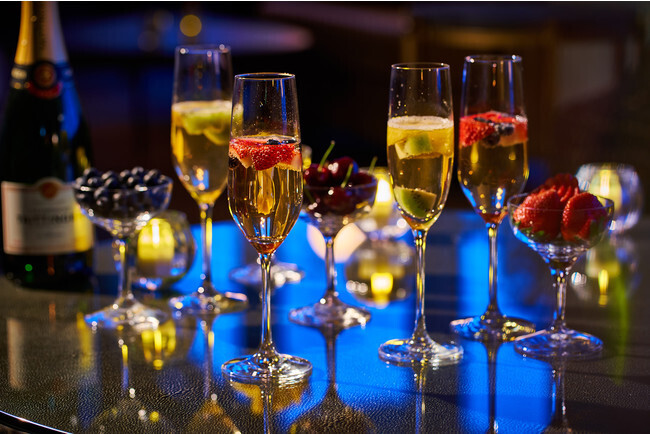 ドリンクはシャンパンの他にもオリジナルカクテルやビール、ハイボールなど約30種類を、120分間のフリーフローでゆっくりとお楽しみ頂け、更にフルーツを使ったノンアルコールカクテルもラインナップしているので、お酒の苦手な方やお車でお越しの方にも安心して利用頂ける。