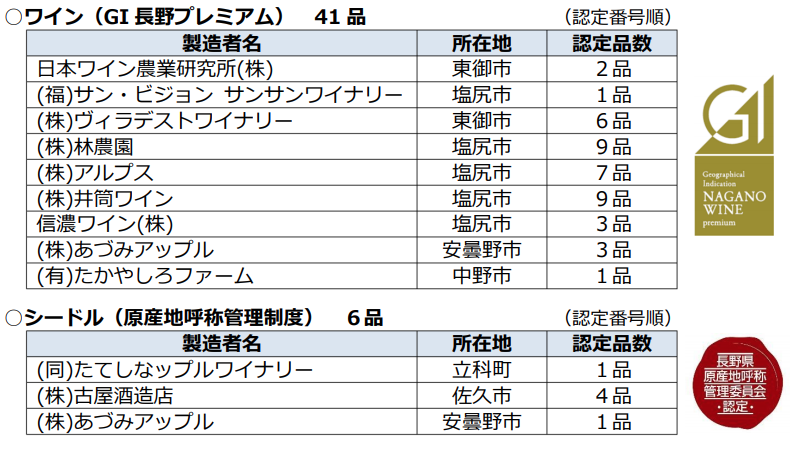 今回のワイン認定品については、メーカーの出荷時期により「GI 長野プレミアム」又は「長野県原産地呼称管理委員会認定」のいずれかのマークが貼付される。個々の認定品については、別添のワイン•シードルの「認定リスト」をご覧下さい。