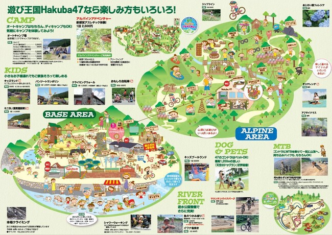 楽しみ方もいろいろ「CAMP」「アルパインアドベンチャー」「天空のドッグラン」「魚のつかみどり」「シャワーウォーキング」「ジップライン」「全天候型BBQ」「MTB」「あじさいの森フォレジア」「お化け屋敷」など、ファミリーで白馬の夏を満喫!