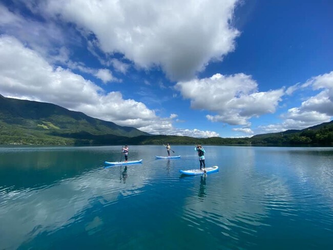 青木湖SUPツアー。初めてのSUPから経験者まで、幅広い層の方に楽しんでいただける。SUPの基本的な乗り方やパドリングを1からご案内。慣れてきたら透明度の高い青木湖の湖上ツーリングへ出かけましょう!そこには非日常的なゆっくりとした時間が流れている。