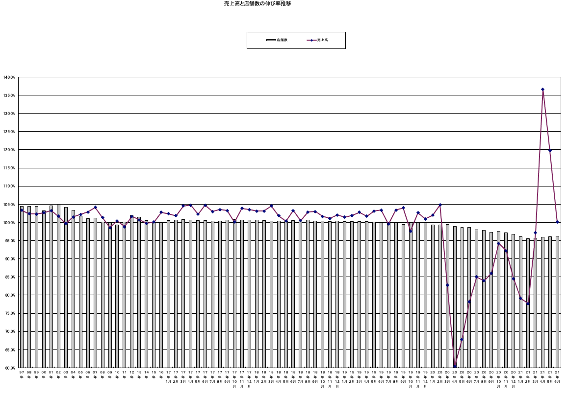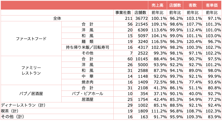 業態別概況ではファーストフード業態のFFは、依然として好調な「洋風」が寄与し、業態全体では売上げ109.1%(一昨年比では96.8%)であった。 「洋風」は堅調な巣籠もり需要により売上げ113.6%。「和風」は新メニューの開発、テイクアウトの予約販売などにより、売上げは104.1%となった。