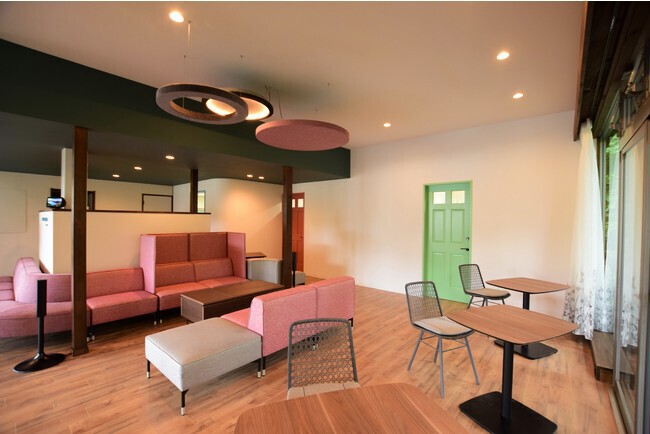 宿泊に関しては食事等がセットになったプランも用意している。フリースペース(室内18席)の家具は一人一人のお客様がリラックスしながら仕事に取り組めるように、セミプライベート型のおこもりソファーや、システムソファーを用意したほか、会議室(1室12名定員)や個室ブース(2室各2名定員)も設け、web会議の実施など様々な働き方に対応している。また屋外にはテラス席(5席)を設置し、川のせせらぎを聞きながら開放的な雰囲気を味わえる。