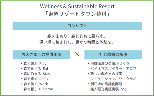 東急リゾートタウン蓼科における「もりぐらし」では、リゾート地が抱えるさまざまな社会課題に対して積極的に解決を試みる未来社会を意識した取り組みの側面を有しているのも特徴だ。蓼科は低湿度で爽やかな気候、豊富な日照や水資源に恵まれた過ごしやすい自然環境である一方リゾート地ならではの様々な課題を抱えている。