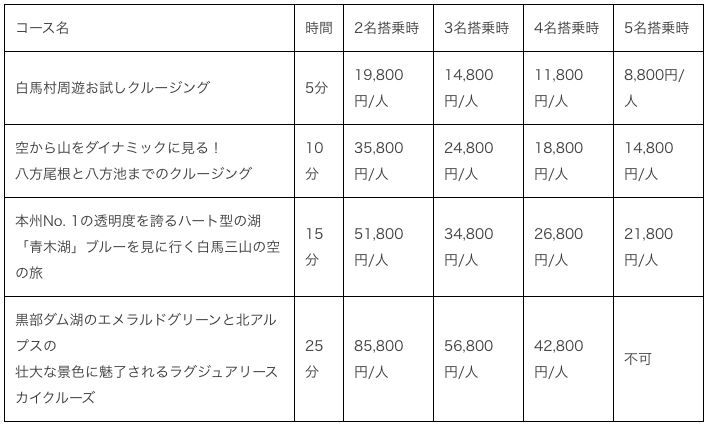 <ヘリコプター遊覧の料金表>