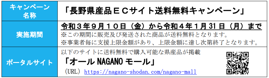 コロナ禍で影響を受けている県産品を応援 「長野県産品ECサイト送料無料キャンペーン」 開始(9月10日~令和4年1月31日まで) |
