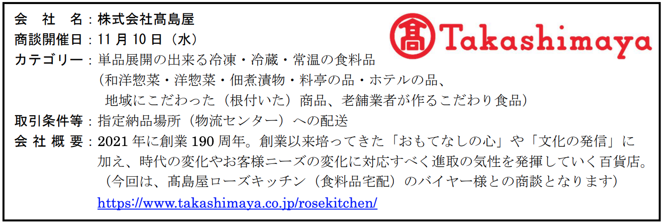 商談会の開催期間は令和3年11月10日(水)~12日(金)に買い手事業者別(下記3)に開催。商談時間は1社あたり30分程度を予定(Web会議システムによる商談)。会場は売り手事業者様のオフィス(自社拠点)若しくは県が指定する会場(長野県庁等)、参加費用は無料(交通費や商品サンプル費等は各自でご負担)となっている。