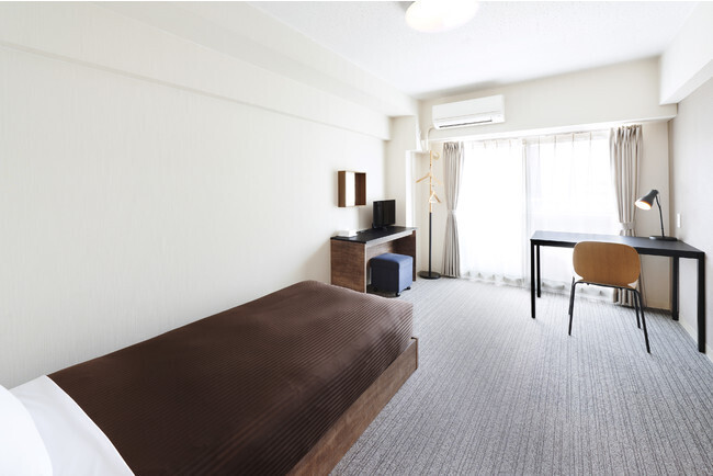 ウィークリー&マンスリープラン対象のシングルルームは、専用の電子レンジや冷蔵庫、食器棚、炊事用シンクなども完備しており、お部屋の中でも簡単な自炊が可能となっている。また、客室面積は17㎡と通常のホテル客室より広い造りとなっており、大きなワーキングデスクも備えているのでリモートワークでも快適に利用いただける。