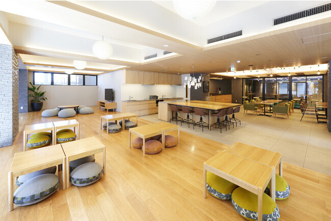 1階のラウンジスペース"THE HOPPERS"は、フリードリンクコーナー、シェアキッチン、TVエリア、漫画コーナー、フリーPCなどを備えており、くつろぎながら明日の計画を立てたり、友達と一緒に料理をしたり、読書やリモートワークに励んだり、思い思いの過ごし方が楽しめる。