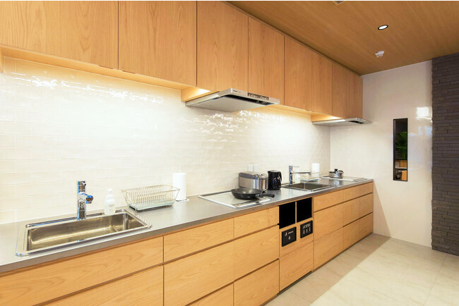 モンタン博多の宿泊者様専用ホテルラウンジ「THE HOPPERS」は、広々とした空間に様々なしシーティングスタイルを設け、気分に合わせてお寛ぎいただけるようにデザインされた大変自由度の高いスペースだ。その中でも特に今回長期滞在のお客様にお薦めが「THE HOPPERS」のオープンキッチン。トースターや必要な調理器具、お皿やカトラリー類などは全て用意しており、滞在中は地元のスーパーで買ってきた食材などを自由に調理してお楽しみいただける。