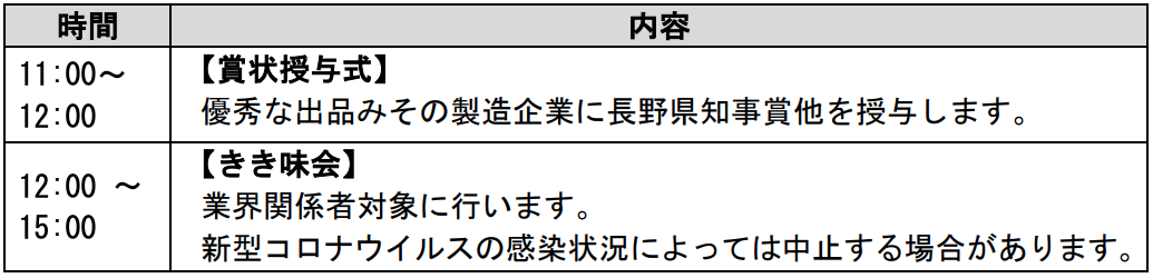 賞状授与式•きき味会は11月5日(金)11:00~15:00、会場は長野県工業技術総合センター食品技術部門 4階講堂で行われる。