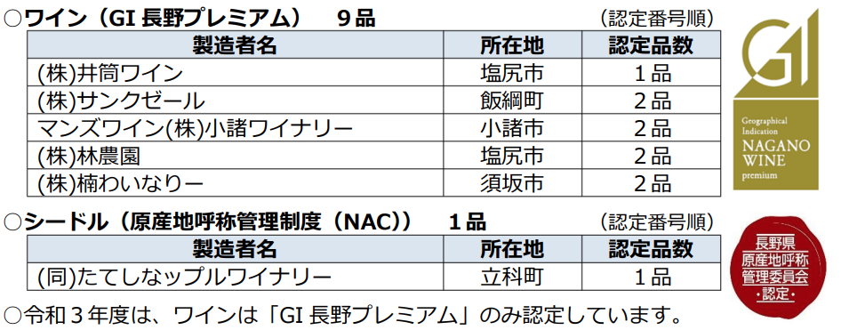 令和3年度はワインは「GI長野プレミアム」のみ認定している。今回のワイン認定品は、メーカーの出荷時期により、「GI長野プレミアム」又は「長野県原産地呼称管理委員会認定(NAC)」いずれかのマークが貼付される。個々の認定品については、別添のワイン・シードルの「認定リスト」をご覧下さい。