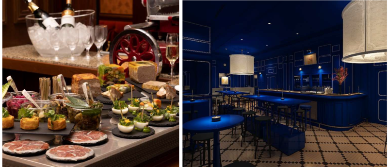 洋食の小皿料理(左)と“Bleu Bar”のコンセプトで改装する「ラ ブラスリー」内バルエリア完成イメージ図(右)