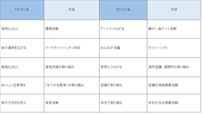 「モスの森」という名称は、一つひとつの小さな社会活動がまるで木の実のように芽を出し、それらが集まることでやがて多様性のある大きな森に育っていくことをイメージして名付けた。環境フードダイバーシティ、食育、店舗による地域貢献活動など10のカテゴリを設け、それぞれの活活動を記事コンテンツとして月2回程度更新していく。今後、公式SNSアカウントとの連動など、さまざまな展開を検討している。