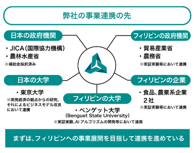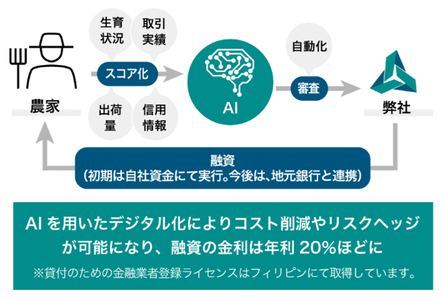 これによりコストを抑えながら、途上国においても適正かつ持続的な農業が成り立つ仕組みを実現する。この事業は農林水産省の補助金、JICA(国際協力機構)における共同事業化が採択済みで、農業に強いフィリピンの国立大学であるベンゲット大学と協力して2021年8月より実証実験開始、2021年9月よりサービスをスタートしている。また、フィリピンにおいて貸付のための金融業者ライセンスを取得しており、政府認定による現地農家グループとの共同事業計画も進んでいる。