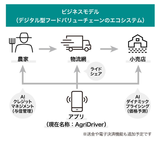 (株)LTIDは、AIを用いて「農家の方への与信管理」や「作物の流通価格予測」を行い、それらのデータを用いることで「貸付(金融)」や「フードバリューチェーン」等をデジタル上で提供する(ビジネスモデルそれぞれの技術に関して国内•国際特許出願中)。