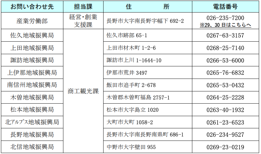 この件のお問い合わせは県産業労働部 経営•創業支援課 金融支援係 (課長)若月真也 (担当)山岸 郁美まで(電話026-235-7200<直通> 026-232-0111<代表>内線2961 FAX026-235-7496