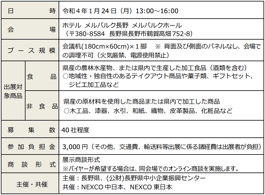 「長野県産品商談会」への出展者を募集 1月24日に長野市のメルパルク長野で 募集数40社程度、参加負担金3,000円 |