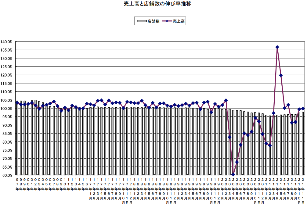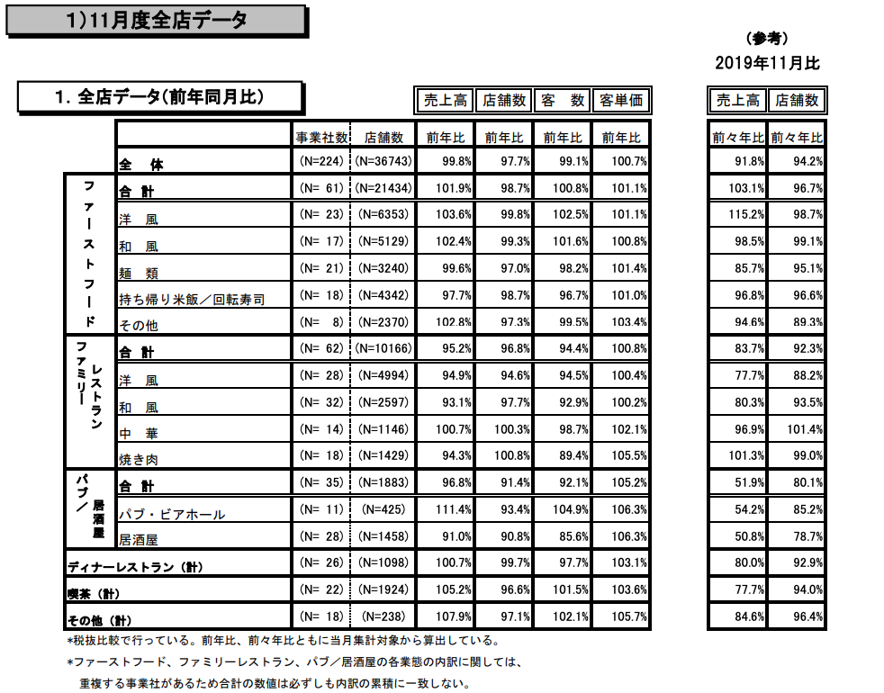 一般社団法人日本フードサービス協会(略称:JF=ジェフ本部東京都港区、赤塚保正会長)は協会会員社を対象とした外食産業市場動向調査令和3年11月度の集計結果をまとめた。「外食産業市場動向調査」は新規店も含めた「全店データ」を業界全体及び業態別に集計し、従来の前年同月比に加えて前々年同月比も算出し掲載している。