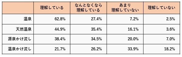 理解していると回答した割合が「温泉」は62.8%なのに対して、「天然温泉」は44.9%、「源泉かけ流し」は38.4%、「温泉かけ流し」は21.7%と低くなっている。「温泉かけ流し」に関しては、理解していない割合の方がやや高くなっており、言葉自体聞いたことがないという方も多かったかもしれない。