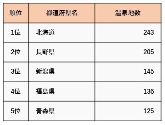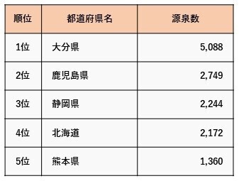 2位は長野県で、蓼科温泉、渋温泉、別所温泉などがある。そして3位新潟県、4位福島県、5位青森県と、本州北部の都道府県が続く。一方で源泉数(未使用の源泉数も含む)となると、大分県が圧倒的に1位となっている。