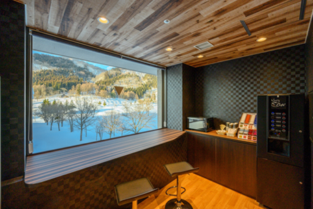 タングラムではこれまでの1~2泊の滞在に加え、ワーケーション、スキーインバウンド、国内旅行会社の⻑期滞在需要拡⼤で、4泊から7泊前後の⻑期滞在利用も増加した。旅のスタイルの変化に合わせ、ワーケーションや⻑期滞在のお客様に、更に快適に滞在いただけるようタングラム1号棟4階を「森のフロア」として昨年12月にリニューアルした。「森のフロア」ではエレベーターが開くと、信州の「森」をイメ ージした空間が広がる。