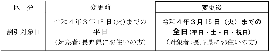 現在、「長野県にお住まいの方」を対象に実施している「この冬どこ行く?ウェルカム信州 アクティビティ割!」の割引対象日を、令和4年2月23日(水)から土曜日、日曜日、祝日を含む「全日」に拡大する。
