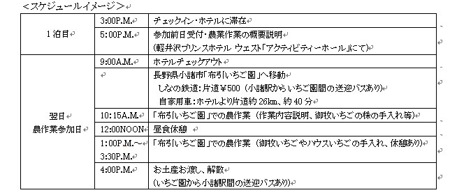 日本のいちご栽培の原種といわれる長野県小諸市の「御牧いちご」を株分けし、育てる援農プラン。農作業を通して地域の農産業活性化を支援する。滞在翌日のいちご農園での農作業に参加後には小諸市からの感謝状の贈呈がある。