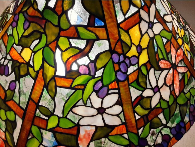 創業当初、晴れやかな宴を楽しむ宴会場として使用されていた文化財「百段階段」。本展では花鳥画や緻密な細工の建具など美しい意匠に満ちた「草丘の間」に大正ロマンの雰囲気に満ちた喫茶室が登場する。期間限定で室内に配したステンドグラスに囲まれながら、タイムスリップをしたような空間で特別な時間をお愉しみ下さい(1名様¥1,000)。