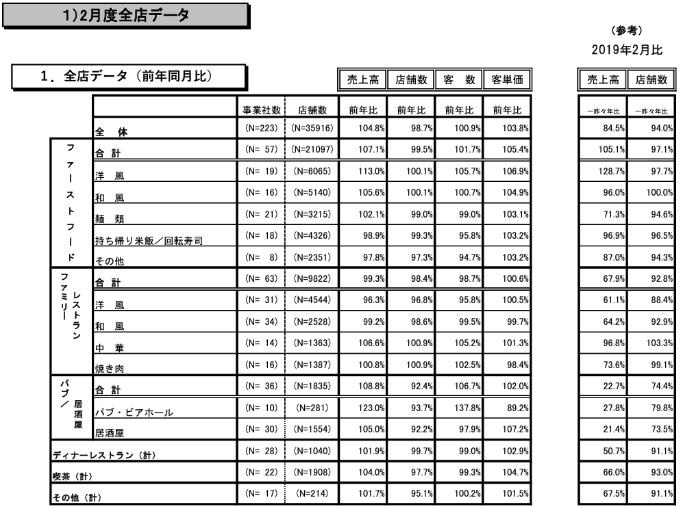 一般社団法人日本フードサービス協会(略称:JF=ジェフ 本部東京都港区 赤塚保正会長)は協会会員社を対象とした外食産業市場動向調査令和4年2月度の集計結果をまとめた。「外食産業市場動向調査」は新規店も含めた「全店データ」を業界全体及び業態別に集計し、従来の前年同月比に加えて一昨々年同月比も算出し掲載している。