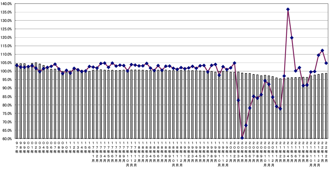 「和風」は持ち帰りや月替わり商品等の好調で105.6%。「麺類」は原材料費高騰などによる価格改定もあり、全体売上げ102.1%となるも一昨々年比では71.3%。「持ち帰り米飯•回転寿司」は「回転寿司」の恵方巻キャンペ ーンは比較的堅調であったが、緊急事態宣言下の昨年の好調には及ばず、売上げは98.9%。「その他」は「カレー」で営業時間短縮店舗が増加し、売上げは97.8%、一昨々年比で87.0%となった。