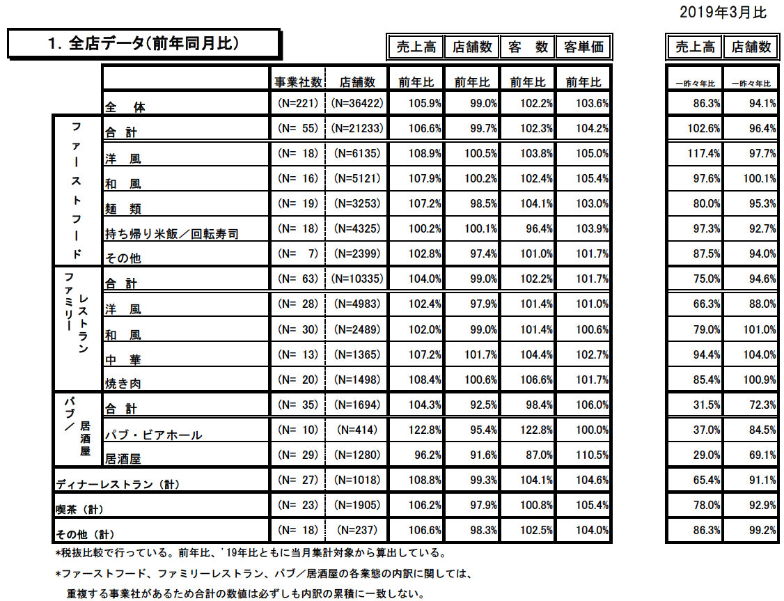 一般社団法人日本フードサービス協会(略称JF=ジェフ本部:東京都港区 赤塚保正会長赤塚保正)は協会会員社を対象とした外食産業市場動向調査2022年3月度の集計結果をまとめまた。「外食産業市場動向調査」は新規店も含めた「全店データ」を業界全体及び業態別に集計し、従来の前年同月比に加えて一昨々年同月比も算出し掲載している。