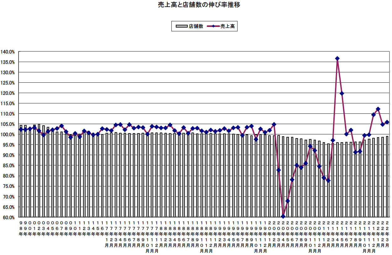 「洋風」は原材料費高騰による価格改定もあり、売上げは前年比108.9%となった。「和風」は深夜営業の再開で店内飲食が増え、売上げは107.9%。「麺類」は22日以降の客足回復が目立ち売上げは107.2%となった。