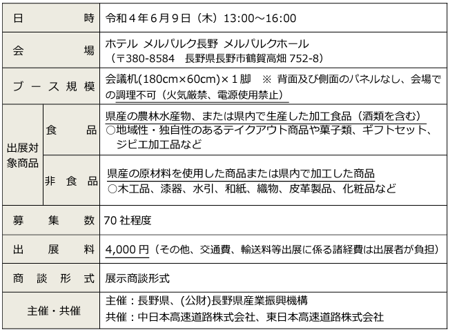 2022.05.02(月) | 「長野県産品商談会」への出展者募集 県内を中心とした高速道路のサービスエリア パーキングエリアの事業展開を希望する事業者 |