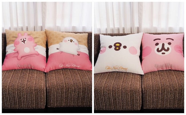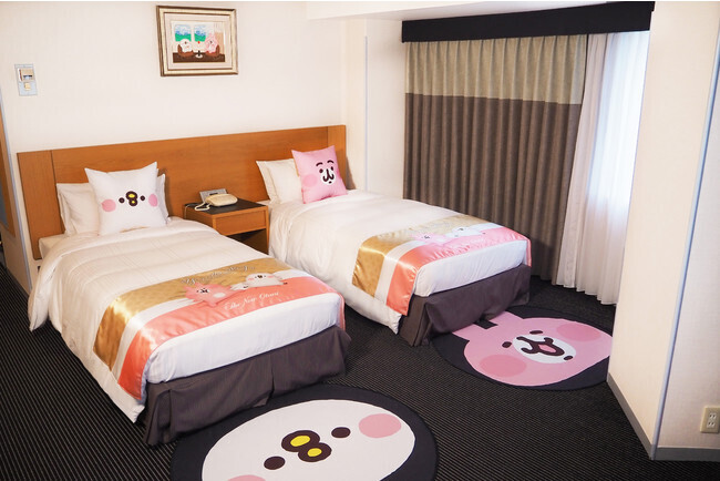 コラボルームに設置された"ピスケ&うさぎ"のオリジナルクッション•アクリルスタンドは、宿泊者向けに販売を実施する。