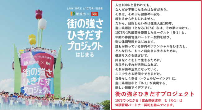 本プロジェクトは、砺波市の「となみ(1073)」が「1073R-1乳酸菌」を使用する「明治プロビオヨーグルトR-1」と共通するという縁をきっかけに構想がスタートした。人生100年時代と呼ばれる現代において、いつまでも健康でいたいと願う人が増えている。