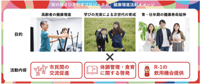 また、明治はR-1の飲用機会を提供するだけでなく、様々な健康増進活動の支援を継続的に行い砺波市民の皆さまの体調管理をサポートしていく。本プロジェクトを通じて「すべての生活者の健康と、心から笑顔でいられる毎日の幸せを、身近な人•コミュニティ•社会全体でわかちあえる状態をつくる」というR-1の使命を実践してまいる。