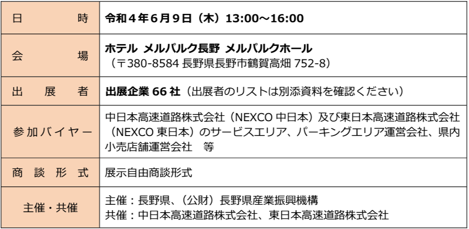 長野県及び(公財)長野県産業振興機構では、県内食品加工企業等の販路拡大と県産品の消費拡大を図るため、県内を中心とした高速道路のサービスエリア、パーキングエリア、小売店における事業展開を希望する事業者を対象としたリアル商談会を1年ぶりに開催する。