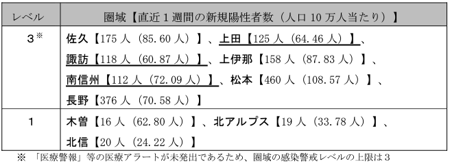 これらの状況は県独自の感染警戒レベルにおいて、圏域のレベルを3に引き上げる目安となる基準(人口10万人当たり60.0人以上)に該当しており、感染拡大に警戒が必要な状態であると認められる。このため上田圏域、諏訪圏域及び南信州圏域の感染警戒レベルを2から3に引き上げる。