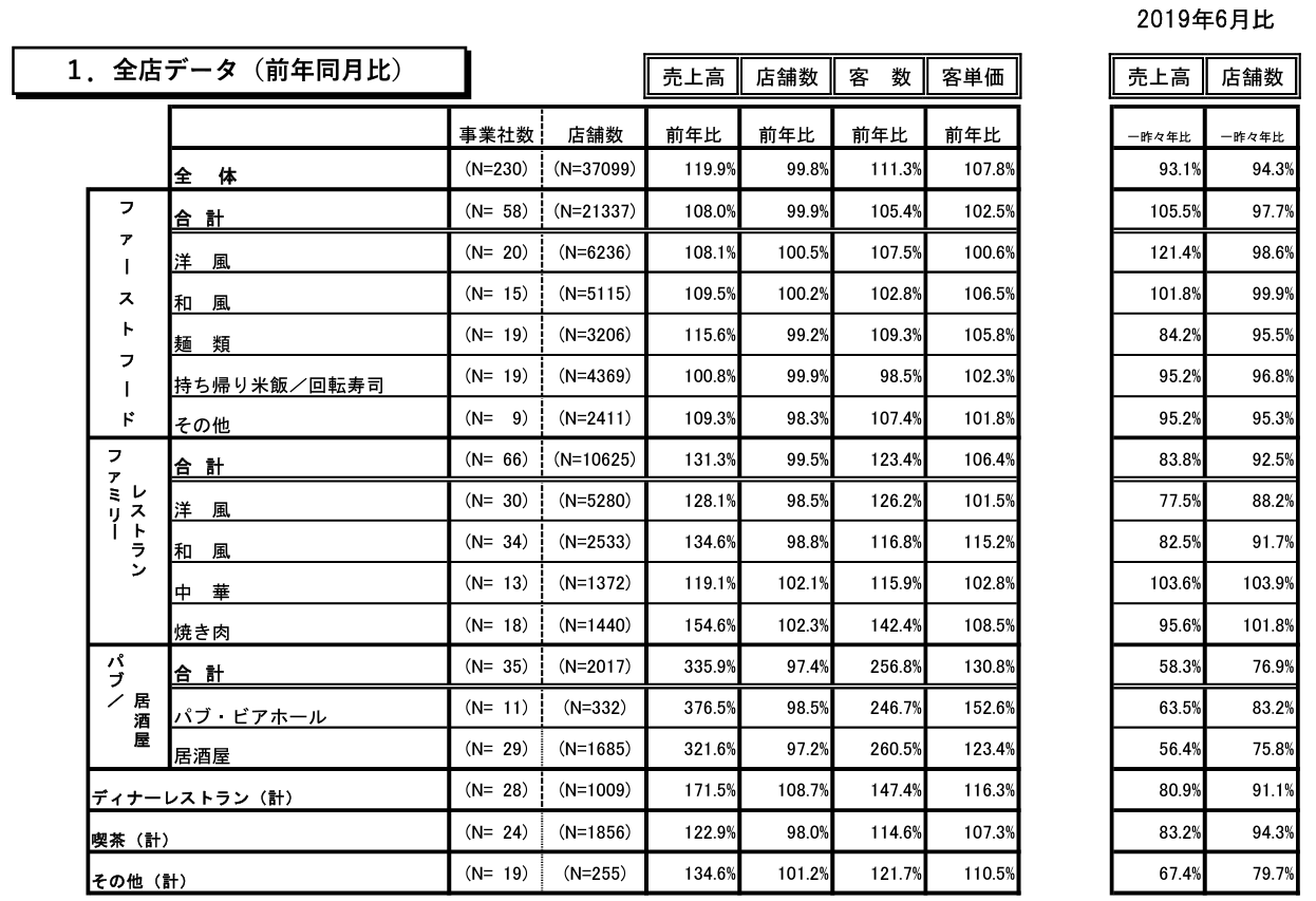 6月の全体概況は、昨年とは違い大都市圏でも「緊急事態宣言」や「まん延防止等重点措置」の適用が無く、外食産業の売上げ前年比は前月同様大幅に伸び、全体売上げは119.9%となった。夜遅い時間帯の集客は依然として弱いものの、「昼の時間帯」「家族客」「土日休日」を中心に客足の好調が継続した。