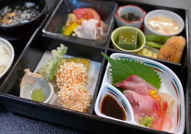 普段は法事やお祝いごとで利用されることの多い、落ち着いた雰囲気の老舗割烹。刺身や南蛮エビの海老しんじょう、焼魚、旬の地場産食材、地元北区産の甘いサツマイモ「しるきーも」を使った料理などが楽しめる。
