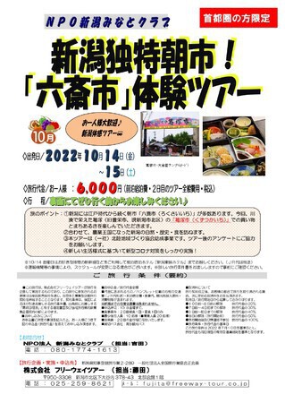 旅行企画・実施・申込先 は(株)フリーウェイツアー (担当)藤田まで(〒950-3308 新潟市北区下大谷内378-43 北部会館1階 電話0250-259-8621)。
