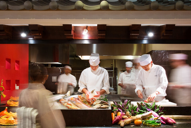 「ミシュランガイド北陸版2021」にて三つ星を獲得。館内は山中塗や九谷焼、加賀水引ランプシェードなどの伝統工芸品を配し、加賀の上質な文化を感じる設え。